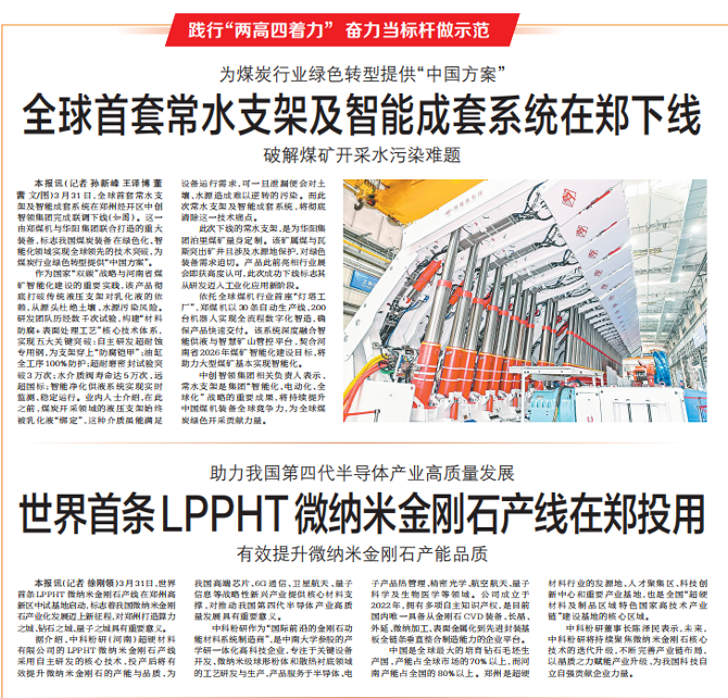 3月31日,全球首套常水支架及智能成套系统在郑州经开区中创智领集团完成联调下线。这一由郑煤机与华阳集团联合打造的重大装备,标志我国煤炭装备在绿色化、智能化领域实现全球领先的技术突破,为煤炭行业绿色转型提供“中国方案”。(今日《郑州日报》2版)