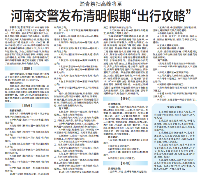 2026年清明节假期共3天,从4月4日(周六)至4月6日(周一)。节日期间,省内天气以晴到多云为主,群众祭祖扫墓、踏青出行活动集中。根据往年交通态势和大数据研判分析,假期全省高速公路出口总流量预计约1100万辆,较2025年同比增长14.82%;日均流量约367万辆,流量峰值将集中出现在4日上午及6日下午返程时段。为全力服务群众出行,河南公安交管部门在扎实做好防事故、保畅通、护安全的基础上,对郑州、开封、洛阳等旅游热门城市的易堵路段、施工路段进行了整理,制作了交通安全提示,集中向社会发布。(今日《郑州日报》5版)