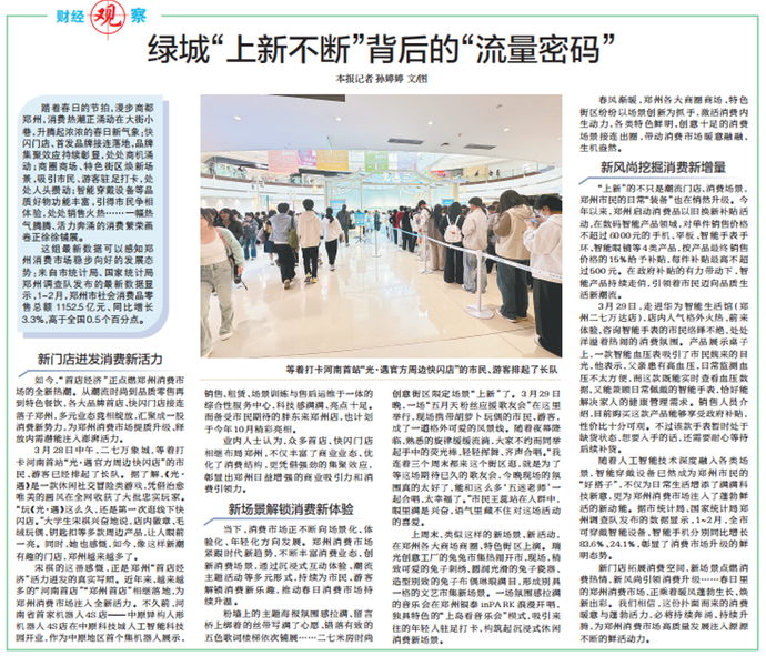 踏着春日的节拍,漫步商都郑州,消费热潮正涌动在大街小巷,升腾起浓浓的春日新气象:快闪门店、首发品牌接连落地,品牌集聚效应持续彰显,处处商机涌动;商圈商场、特色街区焕新场景,吸引市民、游客驻足打卡,处处人头攒动;智能穿戴设备等品质好物功能丰富,引得市民争相体验,处处销售火热……一幅热气腾腾、活力奔涌的消费繁荣画卷正徐徐铺展。(今日《郑州日报》6版)