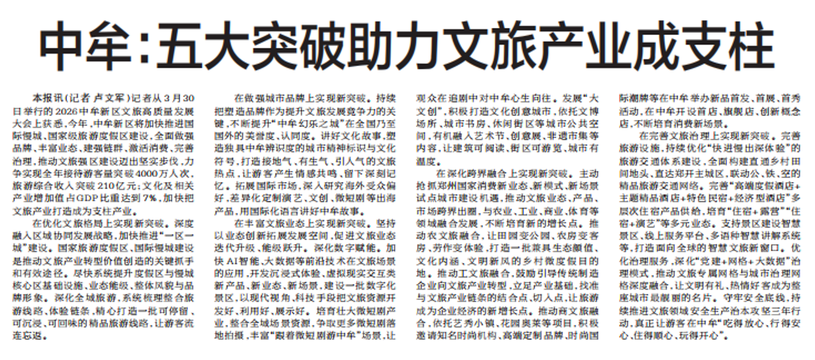 记者从3月30日举行的2026中牟新区文旅高质量发展大会上获悉,今年,中牟新区将加快推进国际慢城、国家级旅游度假区建设,全面做强品牌、丰富业态、建强链群、激活消费、完善治理,推动文旅强区建设迈出坚实步伐,力争实现全年接待游客量突破4000万人次,旅游综合收入突破210亿元;文化及相关产业增加值占GDP比重达到7%,加快把文旅产业打造成为支柱产业。(今日《郑州日报》7版)