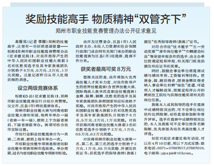 郑州的技能高手,这里有一份好消息请留意——根据《郑州市职业技能竞赛管理办法(征求意见稿)》,对我市推荐产生的中华人民共和国职业技能大赛前3名和优胜奖选手及其专家教练团队分别给予8万元、5万元、3万元、1万元奖励。这是记者昨日从市人社局获得的消息。(今日《郑州日报》2版)