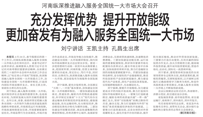 2月24日,春节假期后的第一个工作日,河南纵深推进融入服务全国统一大市场大会在郑州召开。省委书记刘宁出席并讲话,强调要深入贯彻习近平总书记在河南考察时重要讲话精神,全面落实党的二十届四中全会和中央经济工作会议精神,以“咬定青山不放松”的韧劲,纵深推进融入服务全国统一大市场重点工作,加快建设全国统一大市场循环枢纽、打造国内国际市场双循环支点。省长王凯主持,省政协主席孔昌生出席。(今日《郑州日报》1版)