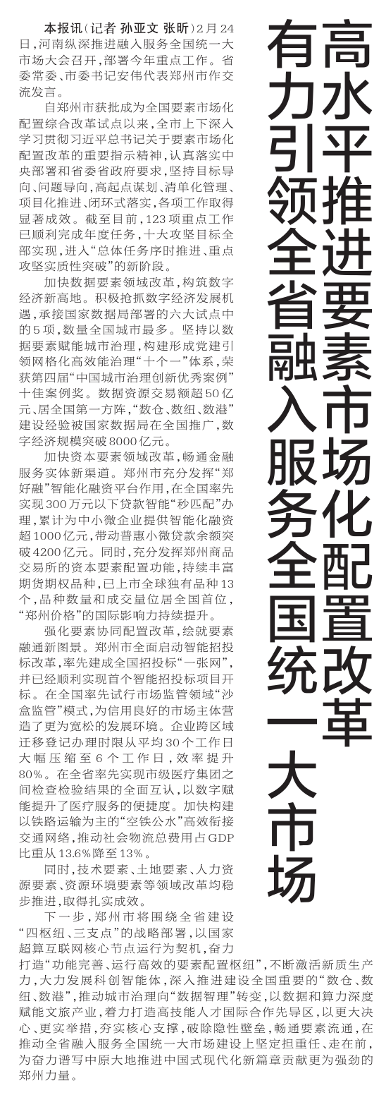 2月24日,河南纵深推进融入服务全国统一大市场大会召开,部署今年重点工作。省委常委、市委书记安伟代表郑州市作交流发言。(今日《郑州日报》1版)