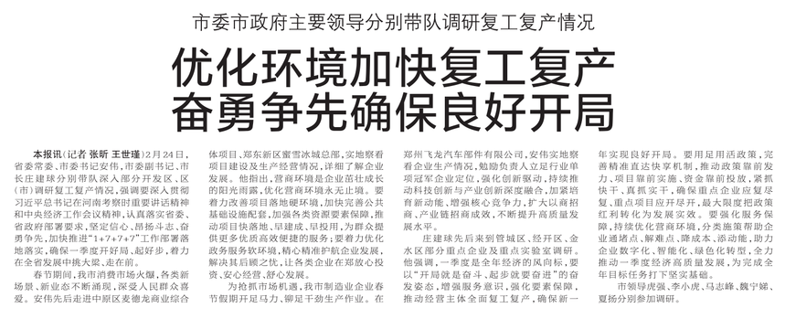 2月24日,省委常委、市委书记安伟,市委副书记、市长庄建球分别带队深入部分开发区、区(市)调研复工复产情况,强调要深入贯彻习近平总书记在河南考察时重要讲话精神和中央经济工作会议精神,认真落实省委、省政府部署要求,坚定信心、昂扬斗志、奋勇争先,加快推进“1+7+7+7”工作部署落地落实,确保一季度开好局、起好步,着力在全省发展中挑大梁、走在前。(今日《郑州日报》1版)