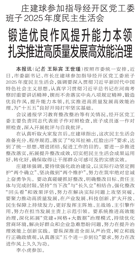 按照市委统一安排,近日,市委副书记、市长庄建球参加指导经开区党工委班子2025年度民主生活会,强调要深入贯彻习近平新时代中国特色社会主义思想,认真学习贯彻习近平总书记在河南考察时重要讲话精神,锲而不舍落实中央八项规定精神,锻造优良作风,提升能力本领,扎实推进高质量发展高效能治理,为“十五五”良好开局打牢坚实基础。(今日《郑州日报》1版)