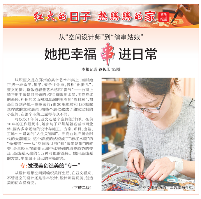 认识亚文是在郑州的某个艺术市集上,当时她正把一堆盒子、箱子、架子往外抻,俗称“出摊儿”。亚文的摊儿整体透着些艺术感和“贵气”——台面上精巧的手编是自己做的;夺目耀眼的水晶、明艳鲜红的朱砂、朴拙的老山檀和温润的玉石的“原材料”,都是自驾到产地一颗颗选的;由20根型材和120颗螺丝拧成的立体展架,把整个展位做成了独家定制的小空间,在整个市集上显得与众不同。(今日《郑州日报》1版、2版)