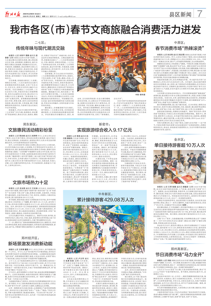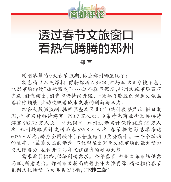 特色街区人气爆棚,博物馆游人如织,机场车站里穿梭不息,电影市场持续“热辣滚烫”……这个春节假期,郑州文旅市场百花齐放、新意频出,消费市场持续升温,一幅热气腾腾的新春文旅画卷徐徐铺展,生动映照着城市发展的创新与活力。(今日《郑州日报》1版、2版)