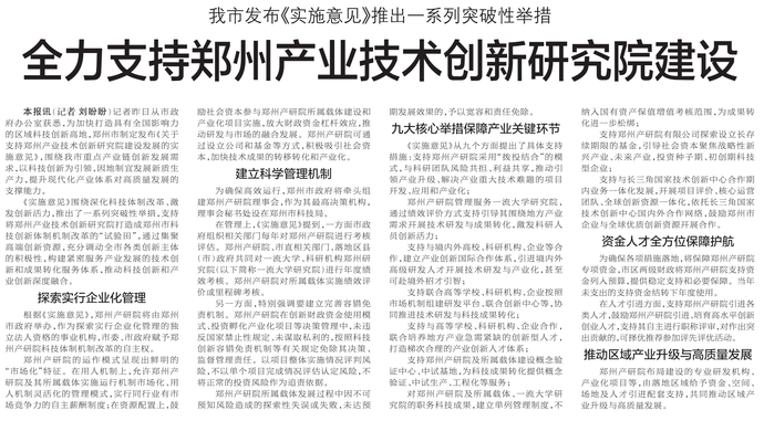 记者昨日从市政府办公室获悉,为加快打造具有全国影响力的区域科技创新高地,郑州市制定发布《关于支持郑州产业技术创新研究院建设发展的实施意见》,围绕我市重点产业链创新发展需求,以科技创新为引领,因地制宜发展新质生产力,提升现代化产业体系对高质量发展的支撑能力。(今日《郑州日报》2版)