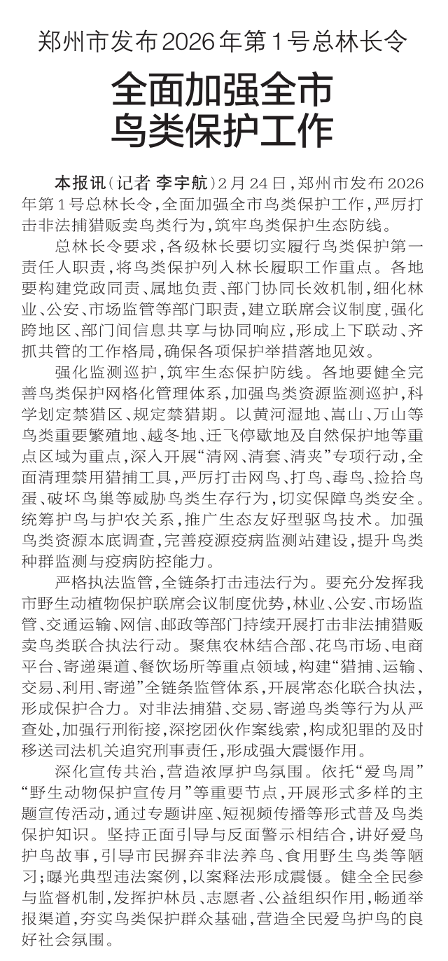 2月24日,郑州市发布2026年第1号总林长令,全面加强全市鸟类保护工作,严厉打击非法捕猎贩卖鸟类行为,筑牢鸟类保护生态防线。(今日《郑州日报》2版)