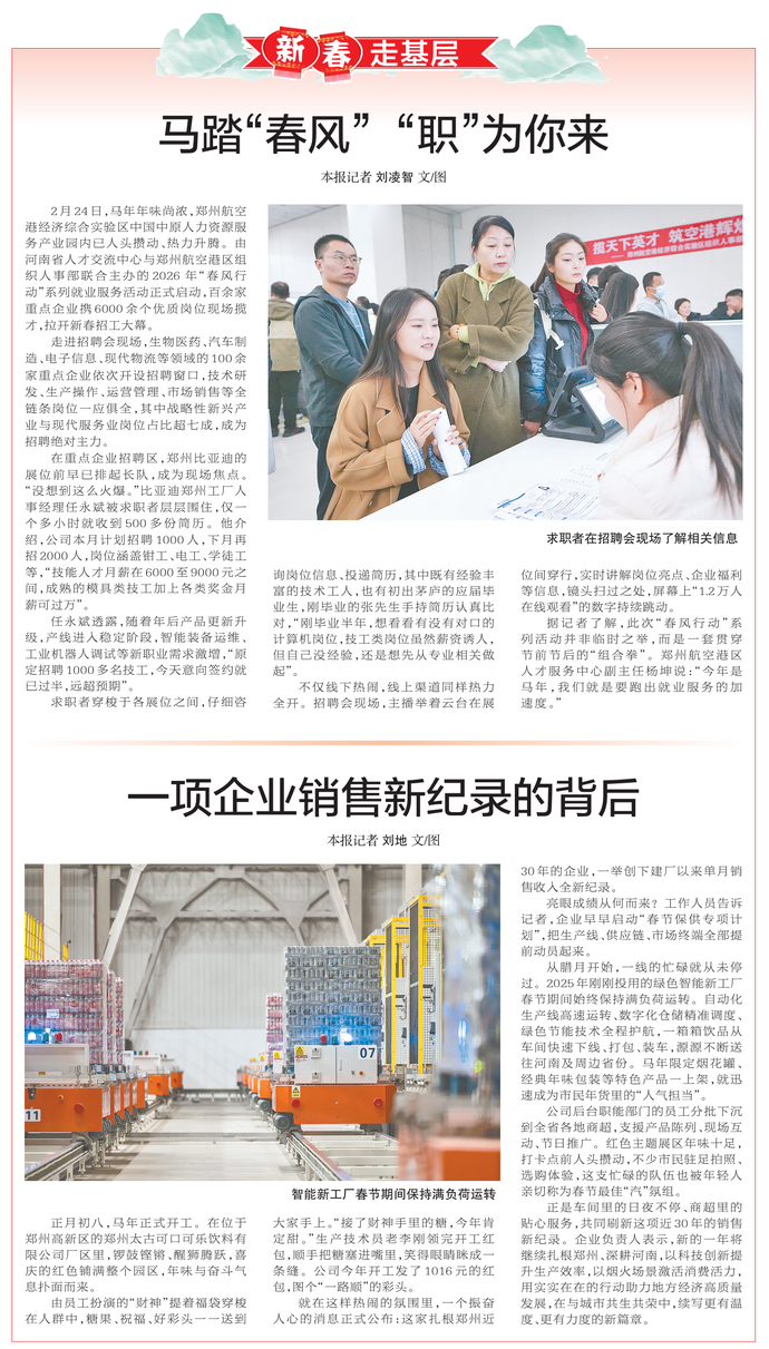 2月24日,马年年味尚浓,郑州航空港经济综合实验区中国中原人力资源服务产业园内已人头攒动、热力升腾。由河南省人才交流中心与郑州航空港区组织人事部联合主办的2026 年“春风行动”系列就业服务活动正式启动,百余家重点企业携6000余个优质岗位现场揽才,拉开新春招工大幕。(今日《郑州日报》2版)