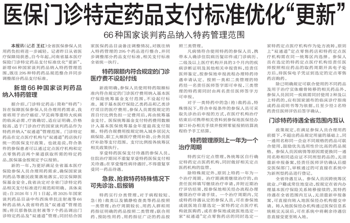 全省医保参保人员用药负担将进一步减轻。记者昨日从省医疗保障局获悉,自今年起,河南省基本医疗保险门诊特定药品支付标准优化“更新”,新增66种国家谈判药品纳入特药管理范围,既往295种特药药品规范整合并同步调整部分药品支付标准。(今日《郑州日报》5版)