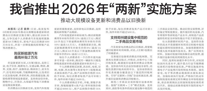 日前,我省发布《河南省2026年推动大规模设备更新和消费品以旧换新实施方案》,提出到2026年底,力争完成个人消费者汽车报废和置换更新50万辆左右,家电产品以旧换新500万台左右,并进一步释放数码和智能产品等消费潜力。(今日《郑州日报》6版)