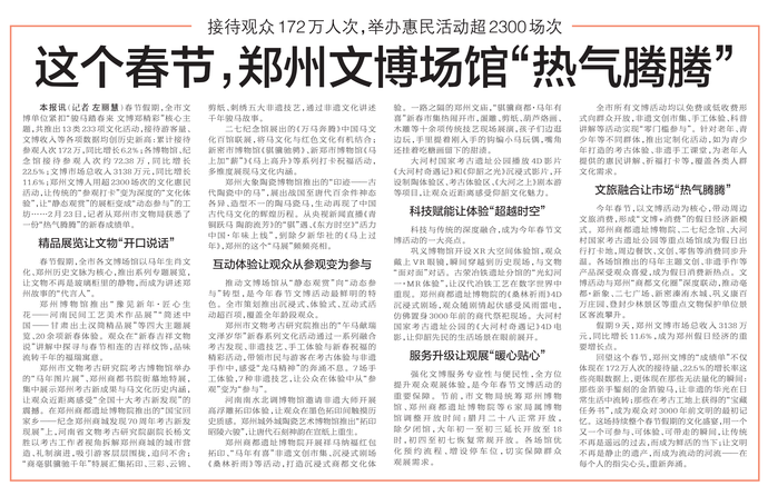 春节假期,全市文博单位紧扣“骏马踏春来 文博郑精彩”核心主题,共推出13类233项文化活动,接待游客量、文博收入等各项数据均创历史新高:累计接待参观人次172万,同比增长6.2%;各博物馆、纪念馆接待参观人次约72.38万,同比增长22.5%;文博市场总收入3138万元,同比增长11.6%;郑州文博人用超2300场次的文化惠民活动,让传统的“参观打卡”变为深度的“文化体验”,让“静态观赏”的展柜变成“动态参与”的工坊……2月23日,记者从郑州市文物局获悉了一份“热气腾腾”的新春成绩单。(今日《郑州日报》8版)