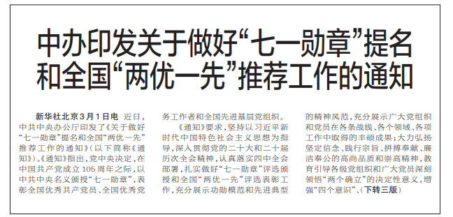 近日,中共中央办公厅印发了《关于做好“七一勋章”提名和全国“两优一先”推荐工作的通知》(以下简称《通知》)。《通知》指出,党中央决定,在中国共产党成立105周年之际,以中共中央名义颁授“七一勋章”,表彰全国优秀共产党员、全国优秀党务工作者和全国先进基层党组织。(今日《郑州日报》1版、3版)