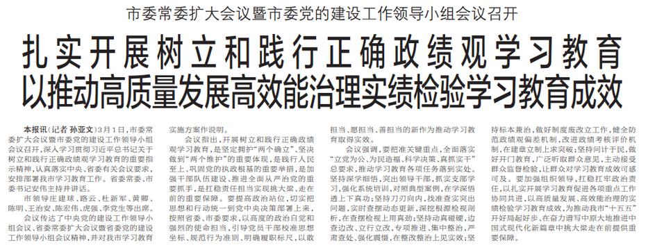 3月1日,市委常委扩大会议暨市委党的建设工作领导小组会议召开,深入学习贯彻习近平总书记关于树立和践行正确政绩观学习教育的重要指示精神,认真落实中央、省委有关会议要求,安排部署我市学习教育工作。省委常委、市委书记安伟主持并讲话。