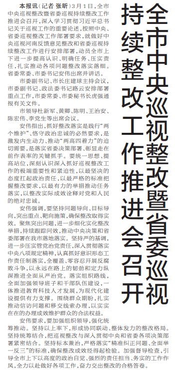 3月1日,全市中央巡视整改暨省委巡视持续整改工作推进会召开,深入学习贯彻习近平总书记关于巡视工作的重要论述,按照中央、省委巡视整改工作部署要求,就做好中央巡视河南反馈意见整改和省委巡视持续整改工作进行安排部署,动员全市上下进一步提高认识、明确任务、压实责任,扎实推动各项问题整改落实落细。省委常委、市委书记安伟出席并讲话。(今日《郑州日报》1版)