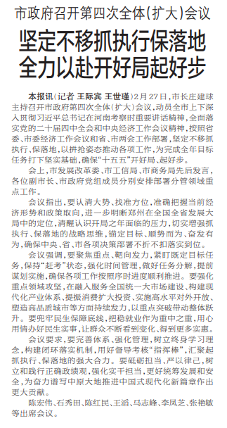 2月27日,市长庄建球主持召开市政府第四次全体(扩大)会议,动员全市上下深入贯彻习近平总书记在河南考察时重要讲话精神,全面落实党的二十届四中全会和中央经济工作会议精神,按照省委、市委经济工作会议和省、市两会工作部署,坚定不移抓执行、保落地,以拼抢姿态推动各项工作,为完成全年目标任务打下坚实基础,确保“十五五”开好局、起好步。(今日《郑州日报》1版)