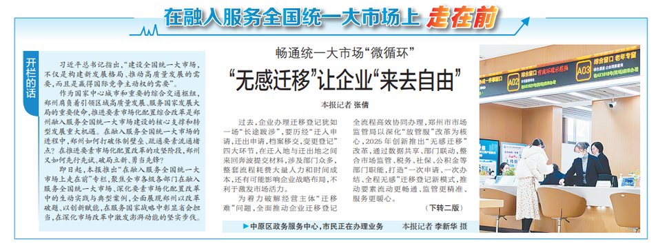 过去,企业办理迁移登记犹如一场“长途跋涉”,要历经“迁入申请,迁出申请,档案移交,变更登记”四大环节,在迁入地与迁出地之间来回奔波提交材料,涉及部门众多,整套流程耗费大量人力和时间成本,还有可能影响企业战略布局,不利于激发市场活力。(今日《郑州日报》1版、2版)
