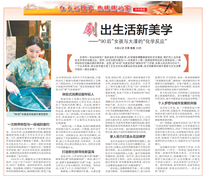 在郑州一处由旧纺织厂房改造的文化园区里,红砖墙体裸露着斑驳的岁月痕迹,粗犷的工业风梁柱无声地诉说着过去。然而,当目光转向屋内——木质架子上那一排排纹样奇幻的大漆饰品时,一种奇妙的时空融合感扑面而来。这里,是“90后”女孩龙丹的“意知手作”工作室,在家人的支持与付出下,一个从无到有、将古老非遗大漆工艺化为时尚消费品的创业故事,成为观察郑州城市更新与文化消费升级的一扇生动窗口。(今日《郑州日报》2版)