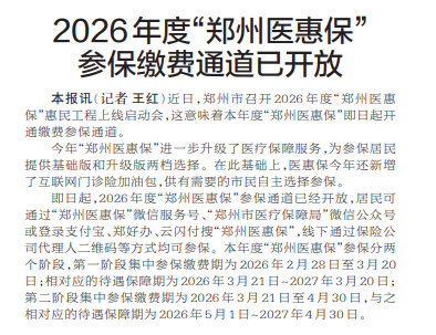 近日,郑州市召开2026年度“郑州医惠保”惠民工程上线启动会,这意味着本年度“郑州医惠保”即日起开通缴费参保通道。(今日《郑州日报》2版)