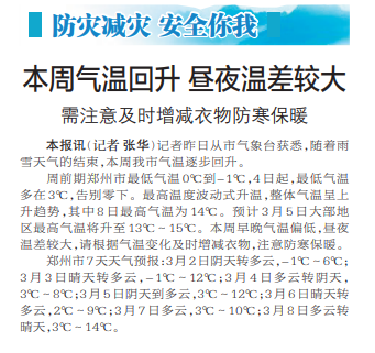 记者昨日从市气象台获悉,随着雨雪天气的结束,本周我市气温逐步回升。(今日《郑州日报》2版)