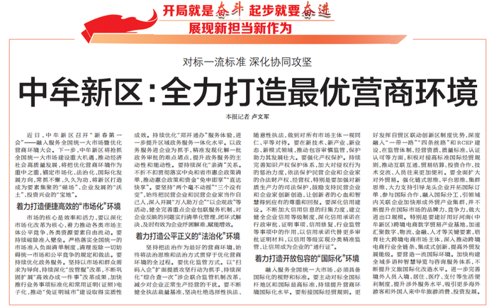 近日,中牟新区召开“新春第一会”——融入服务全国统一大市场暨优化营商环境大会。下一步,中牟新区将抢抓全国统一大市场建设重大机遇,推动经济社会高质量发展,将把优化营商环境作为重中之重,锚定市场化、法治化、国际化发展方向,常抓不懈、久久为功,将新区打造成为要素集聚的“磁场”、企业发展的“沃土”、投资兴业的“宝地”。(今日《郑州日报》5版)
