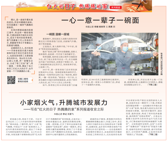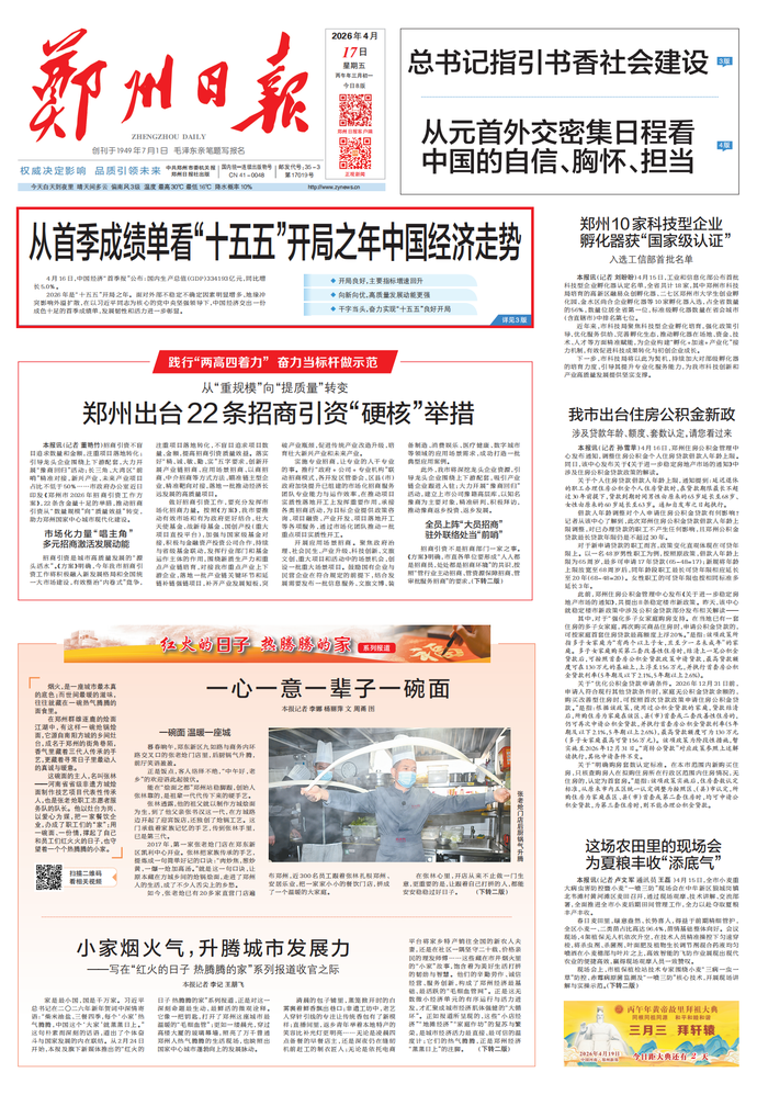 家是最小国,国是千万家。习近平总书记在二〇二六年新年贺词中深情寄语:“柴米油盐、三餐四季,每个‘小家’热气腾腾,中国这个‘大家’就蒸蒸日上。”这句朴素而深刻的话语,道出了个体奋斗与国家发展的内在联结。从2月24日开始,本报及旗下新媒体推出的“红火的日子 热腾腾的家”系列报道,正是对这一深刻命题最生动、最鲜活的微观诠释。它像一把钥匙,打开了郑州这座城市最温暖的“毛细血管”;更如一缕晨光,穿过高楼大厦的玻璃幕墙,照亮了万千普通郑州人热气腾腾的生活现场,也映照出国家中心城市蓬勃向上的发展脉动。(今日《郑州日报》1版、2版)
