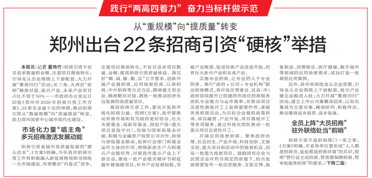 招商引资不盲目追求数量和金额,注重项目落地转化;引导龙头企业围绕上下游配套,大力开展“豫商回归”活动;长三角、大湾区“前哨”精准对接,新兴产业、未来产业项目占比不低于50%……市政府办公室近日印发《郑州市2026年招商引资工作方案》,22条含金量十足的举措,推动招商引资从“数量规模”向“质量效益”转变,助力郑州国家中心城市现代化建设。(今日《郑州日报》1版、2版)