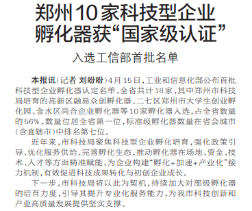 郑州10家科技型企业孵化器获“国家级认证”