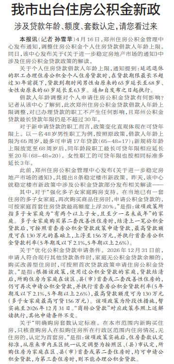 4月16日,郑州住房公积金管理中心发布通知,调整住房公积金个人住房贷款借款人年龄上限。同日,该中心发布关于《关于进一步稳定房地产市场的通知》中涉及住房公积金贷款政策的解读。(今日《郑州日报》1版)