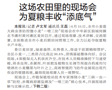 4月15日,全市小麦重大病虫害防控暨小麦“一喷三防”现场会在中牟新区狼城岗镇北韦滩村黄河滩区麦田召开,通过现场观摩、技术讲解、交流部署,全面推进全市小麦后期田间管理工作,全力以赴夺取夏粮丰产丰收。(今日《郑州日报》1版、2版)