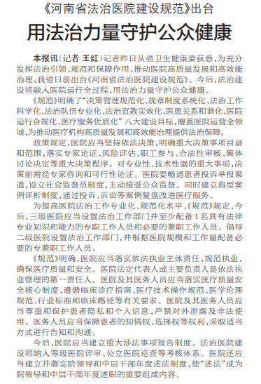 《河南省法治医院建设规范》出台