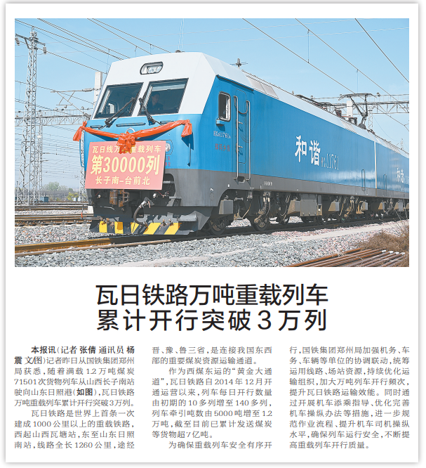 记者昨日从国铁集团郑州局获悉,随着满载1.2万吨煤炭71501次货物列车从山西长子南站驶向山东日照港,瓦日铁路万吨重载列车累计开行突破3万列。(今日《郑州日报》2版)