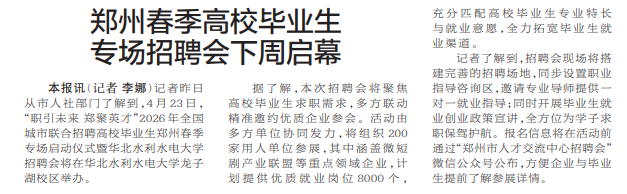 记者昨日从市人社部门了解到,4月23日,“职引未来 郑聚英才”2026年全国城市联合招聘高校毕业生郑州春季专场启动仪式暨华北水利水电大学招聘会将在华北水利水电大学龙子湖校区举办。(今日《郑州日报》2版)