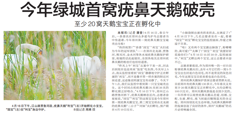 4月16日,春日午后,一条喜讯在郑州众多爱鸟护鸟志愿者当中传递着:今年郑州第一窝疣鼻天鹅宝宝破壳出生啦!(今日《郑州日报》5版)