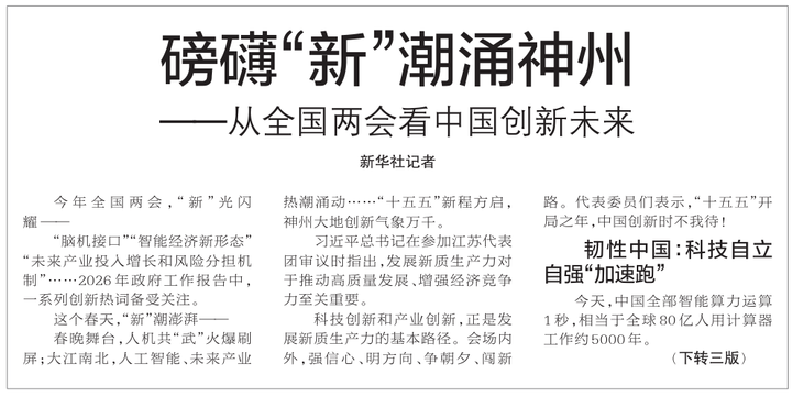 “脑机接口”“智能经济新形态”“未来产业投入增长和风险分担机制”……2026年政府工作报告中,一系列创新热词备受关注。(今日《郑州日报》1版、3版)