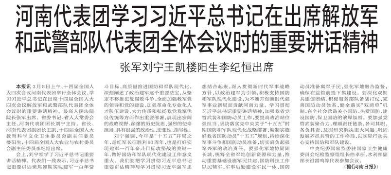 3月8日上午,十四届全国人大四次会议河南代表团举行全体会议,学习习近平总书记在出席十四届全国人大四次会议解放军和武警部队代表团全体会议时的重要讲话精神。最高人民法院院长张军出席。省委书记、省人大常委会主任、河南代表团团长刘宁主持。省长、河南代表团副团长王凯,十四届全国人大教育科学文化卫生委员会副主任委员楼阳生,十四届全国人大农业与农村委员会副主任委员李纪恒出席。(今日《郑州日报》1版)