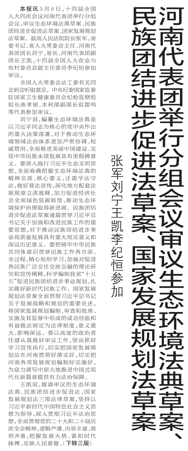 3月8日,十四届全国人大四次会议河南代表团举行分组会议,审议生态环境法典草案、民族团结进步促进法草案、国家发展规划法草案。最高人民法院院长张军,省委书记、省人大常委会主任、河南代表团团长刘宁,省长、河南代表团副团长王凯,十四届全国人大农业与农村委员会副主任委员李纪恒参加审议。(今日《郑州日报》1版、3版)