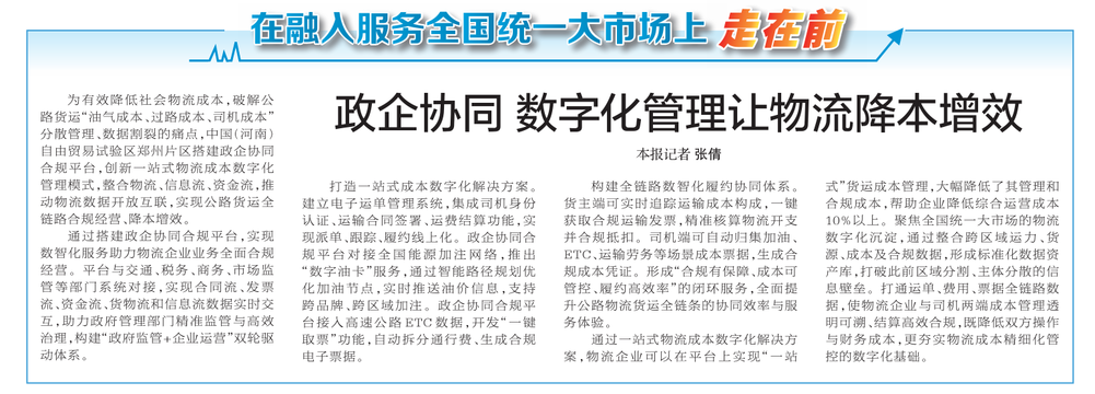 为有效降低社会物流成本,破解公路货运“油气成本、过路成本、司机成本”分散管理、数据割裂的痛点,中国(河南)自由贸易试验区郑州片区搭建政企协同合规平台,创新一站式物流成本数字化管理模式,整合物流、信息流、资金流,推动物流数据开放互联,实现公路货运全链路合规经营、降本增效。(今日《郑州日报》1版)