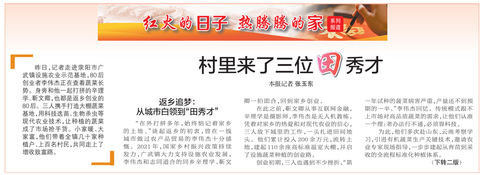 昨日,记者走进荥阳市广武镇设施农业示范基地,80后创业者李伟杰正在查看蔬菜长势。身旁和他一起打拼的辛理学、靳文卿,也都是返乡创业的80后。三人携手打造大棚蔬菜基地,用科技选苗、生物杀虫等现代农业技术,让种植的蔬菜成了市场抢手货。小家暖、大家富,他们带着全镇几十家种植户、上百名村民,共同走上了增收致富路。(今日《郑州日报》1版、2版)