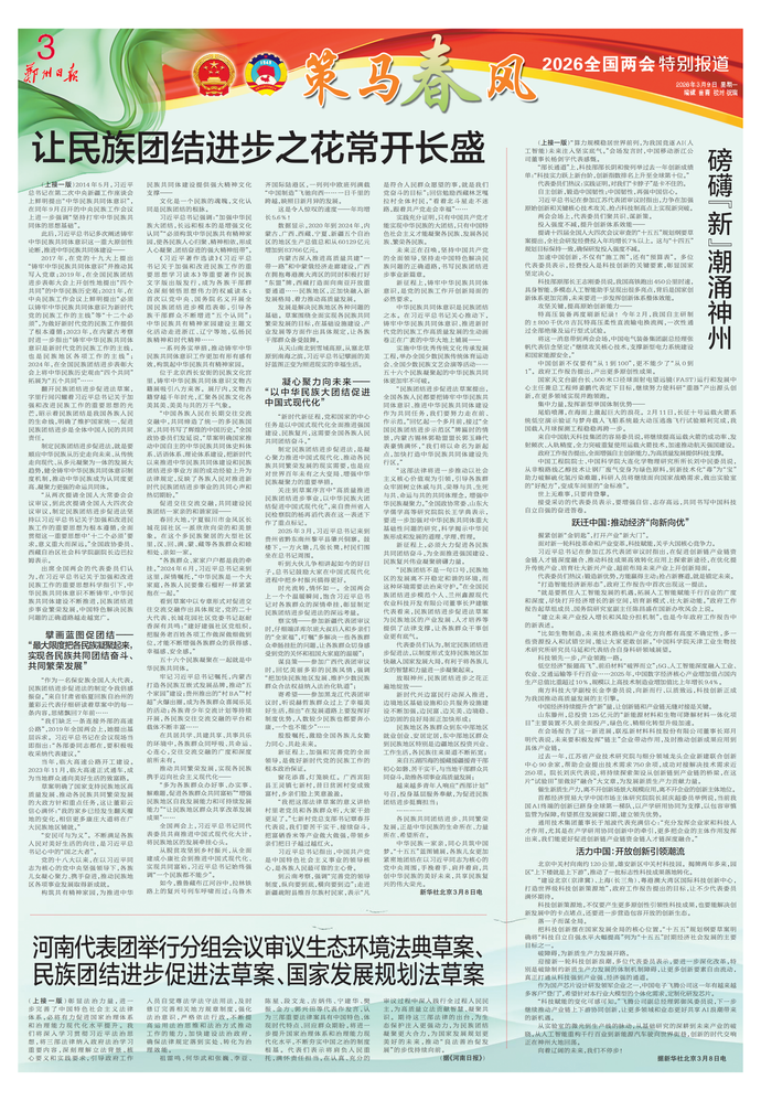 “十五五”大幕已经开启,中国式现代化展现出更加光明的前景。出席全国两会的代表委员一致认为,制定民族团结进步促进法恰逢其时,将进一步增强中华民族凝聚力向心力,推动全国各族人民更加紧密团结在以习近平同志为核心的党中央周围,汇聚起同心共圆中国梦的强大合力。(今日《郑州日报》1版、3版)