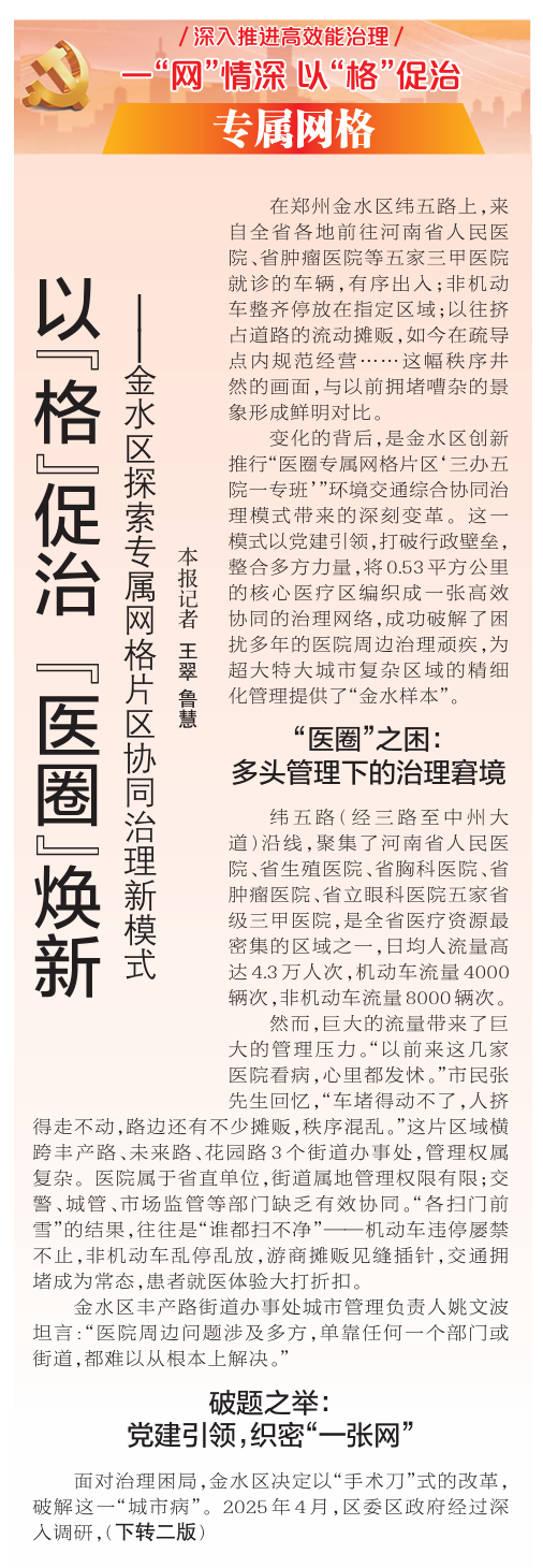 在郑州金水区纬五路上,来自全省各地前往河南省人民医院、省肿瘤医院等五家三甲医院就诊的车辆,有序出入;非机动车整齐停放在指定区域;以往挤占道路的流动摊贩,如今在疏导点内规范经营……这幅秩序井然的画面,与以前拥堵嘈杂的景象形成鲜明对比。(今日《郑州日报》1版、2版)