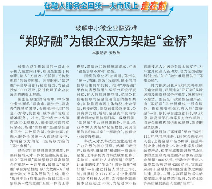 郑州合成生物领域的一家企业手握大量意向订单,却因企业处于初创期,陷入“无营收、无抵押、无传统担保”的融资困境。关键时刻,“郑好融”平台联合银行精准发力,为企业授信2000万元,及时化解了企业发展面临的资金难题。(今日《郑州日报》1版)