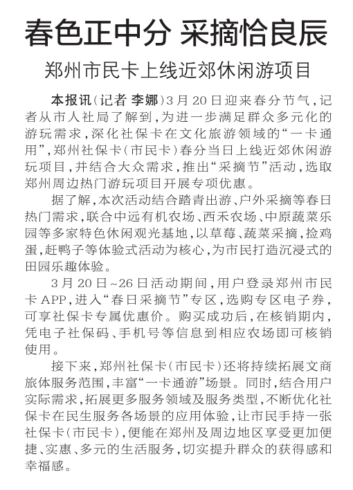 3月20日迎来春分节气,记者从市人社局了解到,为进一步满足群众多元化的游玩需求,深化社保卡在文化旅游领域的“一卡通用”,郑州社保卡(市民卡)春分当日上线近郊休闲游玩项目,并结合大众需求,推出“采摘节”活动,选取郑州周边热门游玩项目开展专项优惠。(今日《郑州日报》1版)