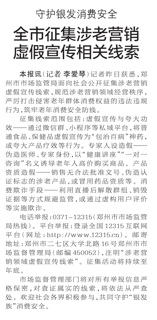 记者昨日获悉,郑州市市场监管局面向社会公开征集涉老营销虚假宣传线索,规范涉老营销领域经营秩序,严厉打击侵害老年群体消费权益的违法违规行为,筑牢老年消费安全防线。(今日《郑州日报》2版)
