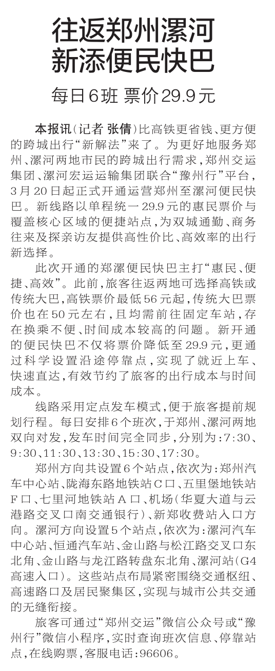 比高铁更省钱、更方便的跨城出行“新解法”来了。为更好地服务郑州、漯河两地市民的跨城出行需求,郑州交运集团、漯河宏运运输集团联合“豫州行”平台,3月20日起正式开通运营郑州至漯河便民快巴。新线路以单程统一29.9元的惠民票价与覆盖核心区域的便捷站点,为双城通勤、商务往来及探亲访友提供高性价比、高效率的出行新选择。(今日《郑州日报》2版)