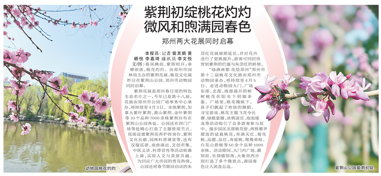 春风拂面,紫荆初开;垂柳依依,桃花灼灼。由郑州市园林局主办的紫荆花展、桃花文化展昨日在紫荆山公园、郑州市动物园同时启幕。(今日《郑州日报》2版)