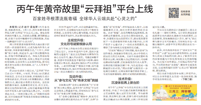 四月春光里,根脉再相连。4月1日,丙午年黄帝故里拜祖大典“云拜祖”平台正式上线。身处全球各地的华夏儿女,只需轻点屏幕,便可跨越山海,在数字空间中触摸中华文明的根脉,共赴一场跨越时空的“心灵之约”。(今日《郑州日报》1版、2版)