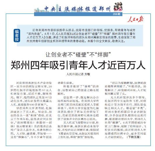 近年来郑州市委组织部牵头抓总,统筹市直部门补短板、优服务,帮助青年与城市“双向奔赴”。4月1日,《人民日报》以《让创业者不“碰壁”不“绊脚” 郑州四年吸引青年人才近百万人》为题,讲述了杜振洋和他的团队在郑州高新区创业的故事,生动呈现了郑州支持青年创新创业系列举措带来的青春动能。本报今日全文转发,敬请关注。