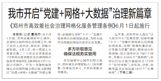 《郑州市高效能社会治理网格化服务管理条例》6月1日起施行